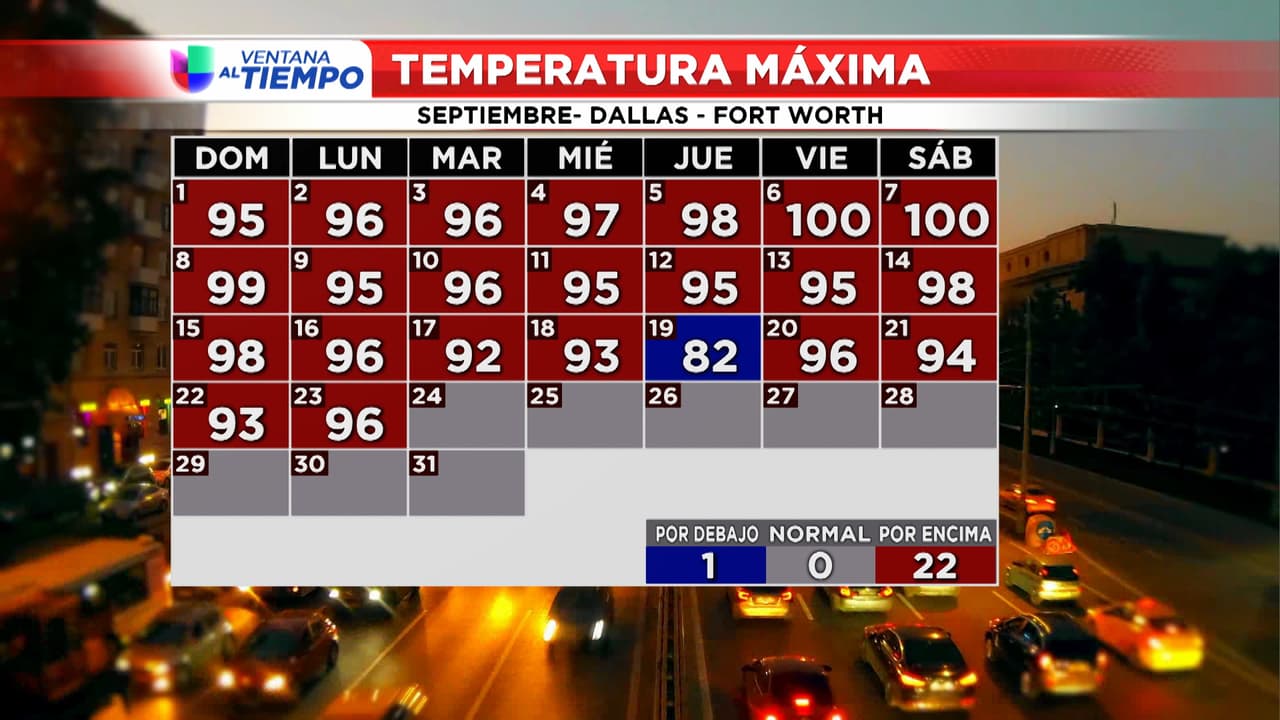 Hasta ahora, este mes de septiembre es el segundo más cálido en la historia de Dallas-Fort Worth (El más cálido fue en 1939). Sin embargo todavía falta una semana en septiembre, y como nos explica nuestra meteoróloga Nelly Carreño, no bajará la temperatura la próxima semana.