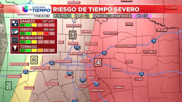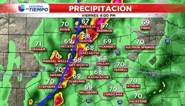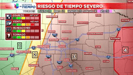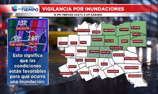 También tenemos riesgo de inundaciones repentinas. El Servicio Nacional Meteorológico emitió una Vigilancia por Inundaciones Repentinas para algunos condados en el norte de Texas. Esta Vigilancia (Flash Flood Watch) estará vigente hasta el sábado a las 3 am. Podríamos recibir entre 1” hasta 3” de lluvia el viernes en la tarde y noche.