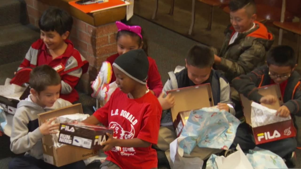 Estudiantes de bajos recursos de una escuela primaria en Dallas reciben zapatos como regalo de Navidad