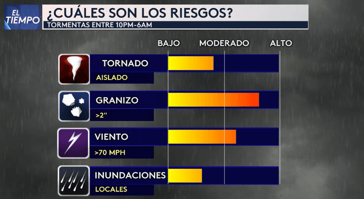 El riesgo de tiempo severo con esta ronda de tormentas es “condicional”, y depende de cuán fuerte sea la inestabilidad y la corriente accedente. De desarrollarse tormentas, la amenaza principal con esta ronda es granizos y vientos dañinos.