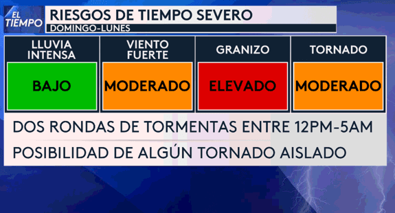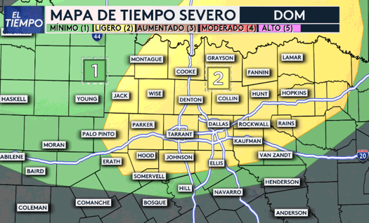 El peligro de tormentas fuertes a severas sobre el Metroplex aumenta durante la tarde del domingo hacia la madrugada de lunes. Dos rondas de tormentas serán posibles. La primera se desarrollará a lo largo de un frente cálido que se moverá de sur a norte sobre el norte de Texas.