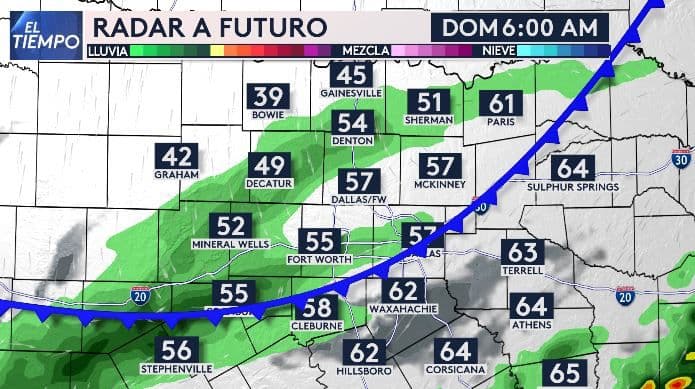 El domingo en la mañana pasará un frente frío que traerá lluvias ligeras a moderadas dispersas al Norte de Texas hasta alrededor de la 1:00 pm.