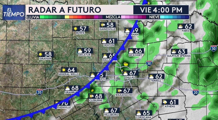 DALLAS, Texas .- En estos momentos 3 PM el frente frío está entrando a Fort Worth. El frente se desplazara del oeste hacia el este en las próximas 3 horas. Existe la baja posibilidad de una tormenta severa aislada en el norte de Texas en las próximas 3 horas. Si se produce una de estas tormentas, el riesgo principal será fuertes vientos y no se puede descartar un tornado ( aunque el riesgo es muy bajo).