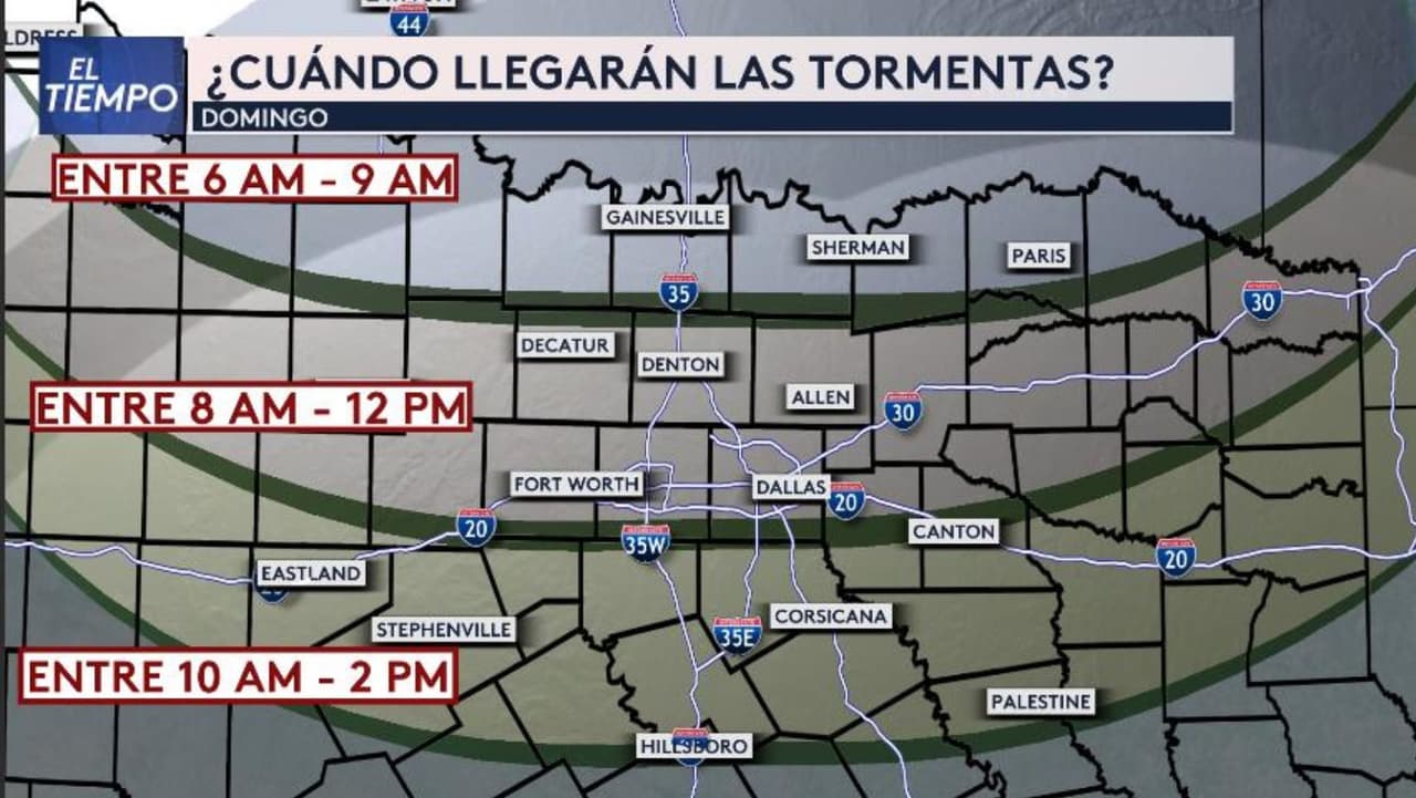 Estas rondas de tormentas bajarán hacia Dallas y Fort Worth entre las 8:00 am y las 12:00 pm, por eso debe planificar sus actividades matutinas y se recomienda que permanezca en casa.