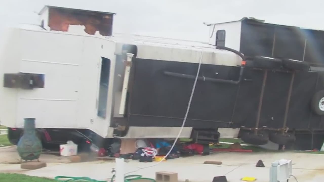 Una casa móvil fue violentamente levantada por los fuertes vientos provocados por Harvey. Los dueños del vehículo lograron evacuar de manera oportuna y por fortuna no se registraron heridos.