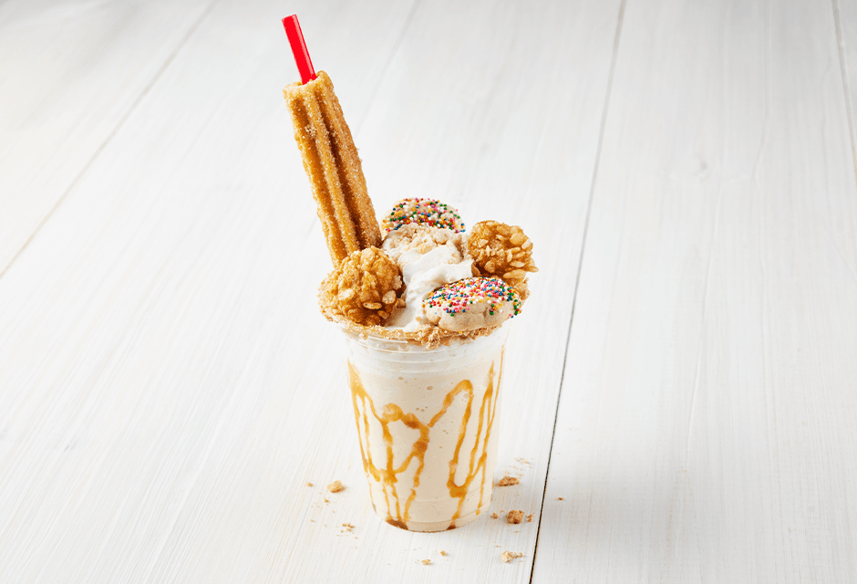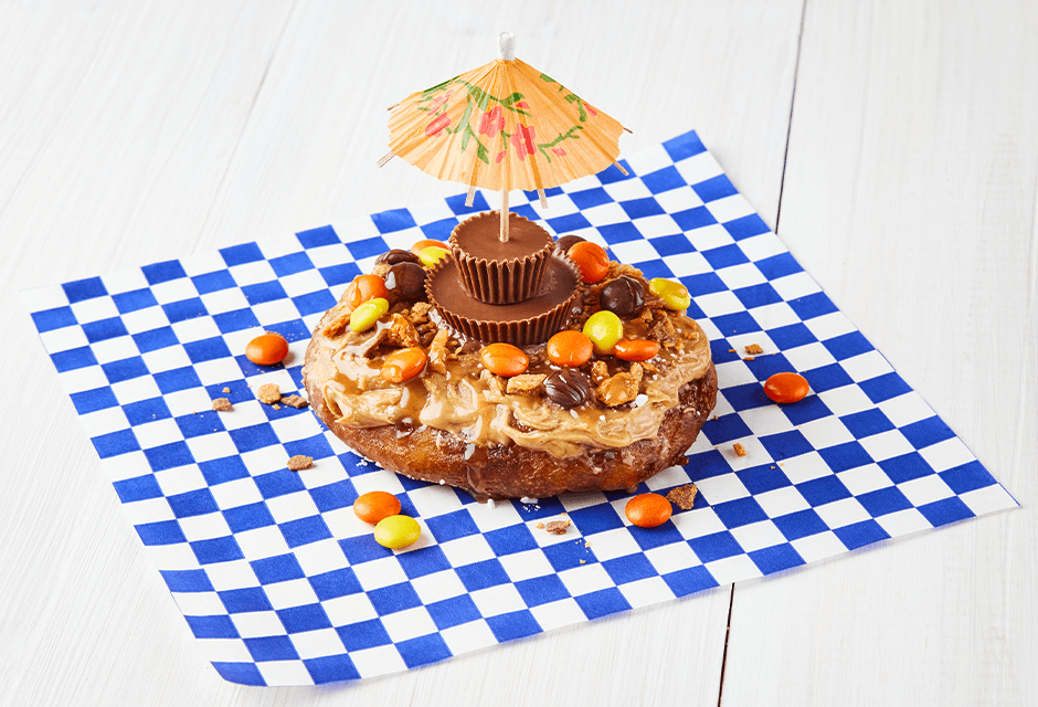 Incluye un bollo de miel frito, inyectado con caramelo y cubierto con mantequilla de maní.