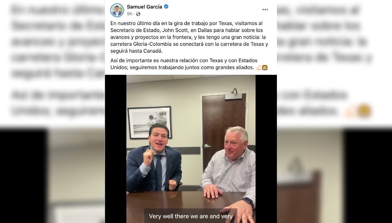 John B. Scott, el secretario de estado de Texas, afirmó en un video con García que se publicó en las redes sociales que habrá una carretera de cuota del Puente Colombia –donde está la 255– a la Interestatal 35, y después una continuación.