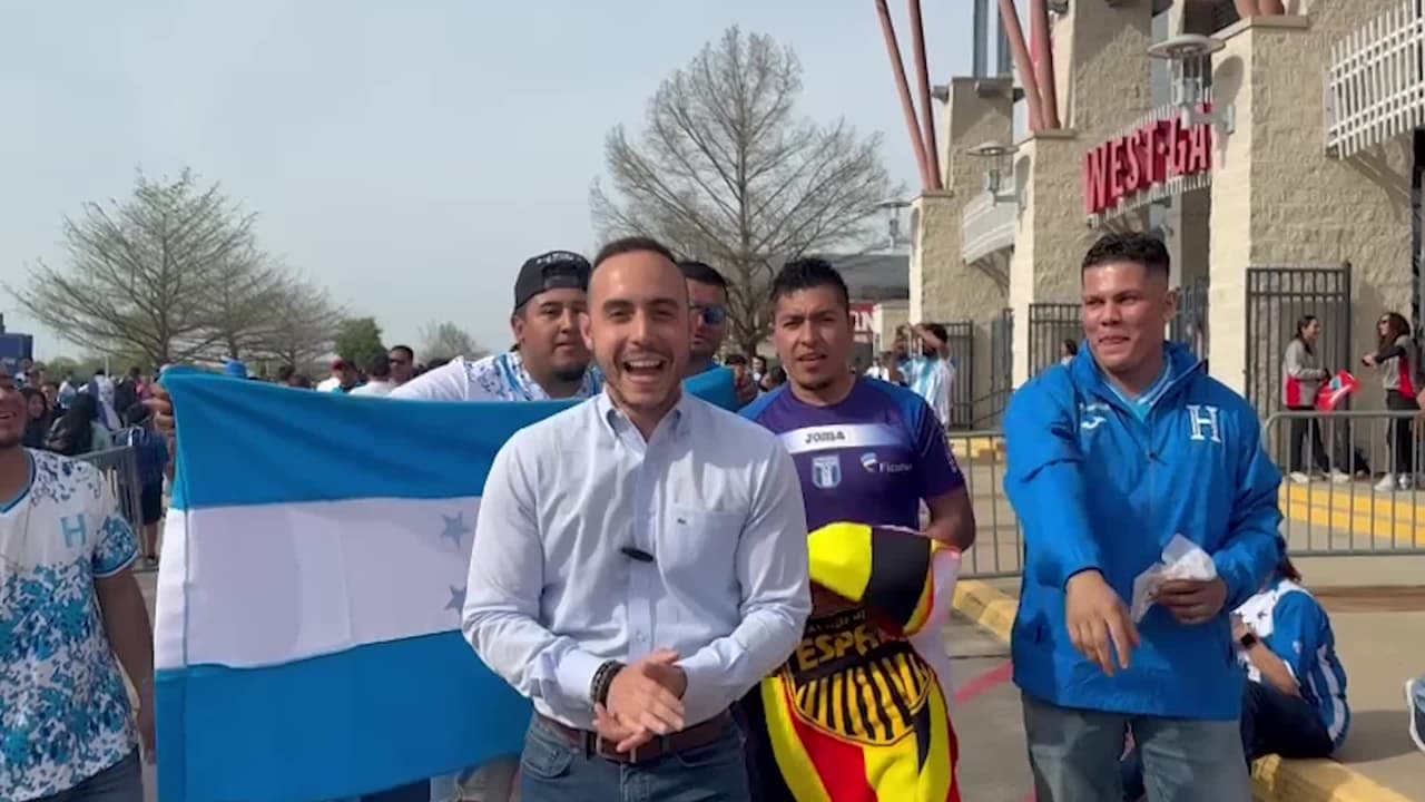 El "clásico de entroamérica" es el partido de Honduras Vs. Costa Rica, donde cientos de aficionados están haciendo un gran ambiente afuera del Estadio Toyota en Fisco, Texas.