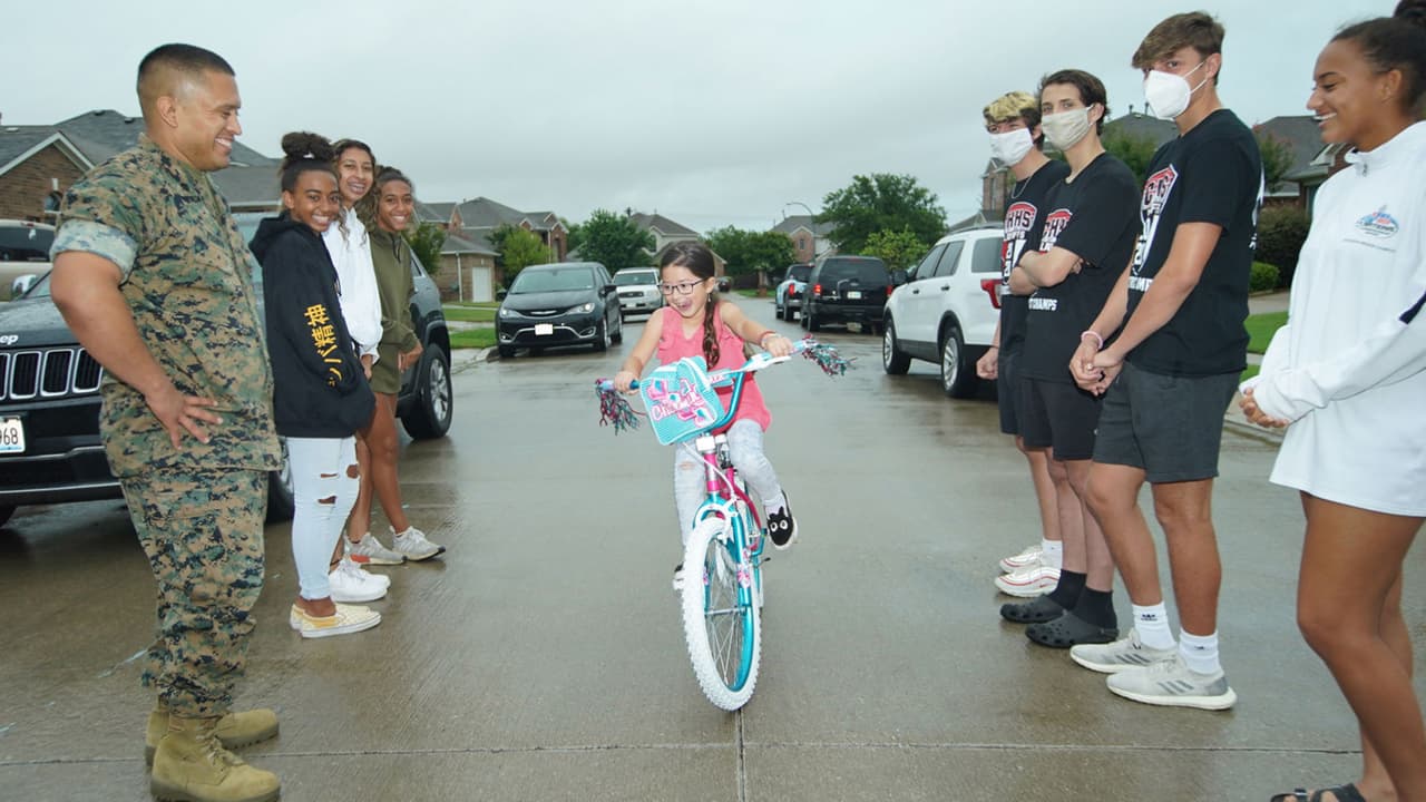 Hacen sueño realidad a niña hispana del norte de Texas con la visita de su padre militar y una bicicleta nueva