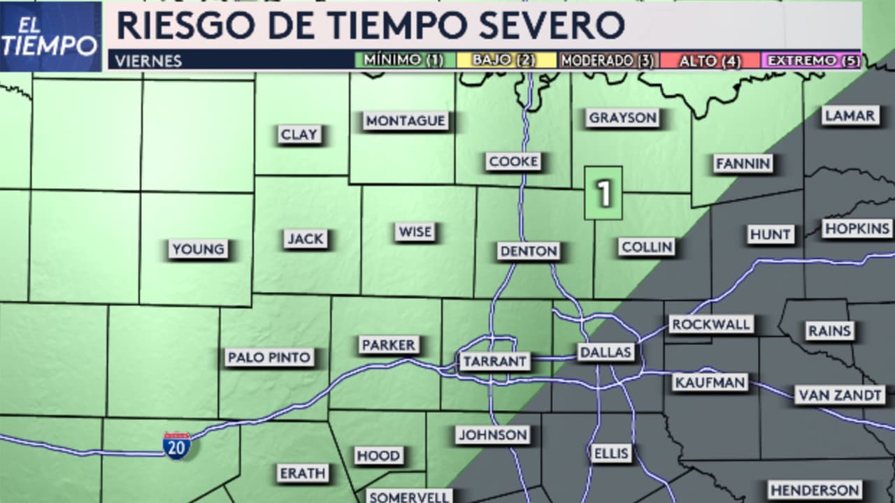 Hay un riesgo ligero de tiempo severo para condados muy al norte del norte de Texas, incluye Bowie, Mineral Wells y al noreste del Metroplex. Este riesgo no incluye Dallas y Fort Worth, pues no recibirá lluvias.