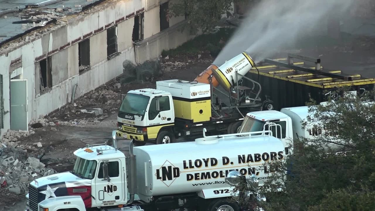 Momento en el que la implosión de un edificio de 11 pisos en la ciudad de Dallas no salió del todo bien. La estructura exterior se vino abajo, como se esperaba, pero la torre central no, esta quedo medio parada.