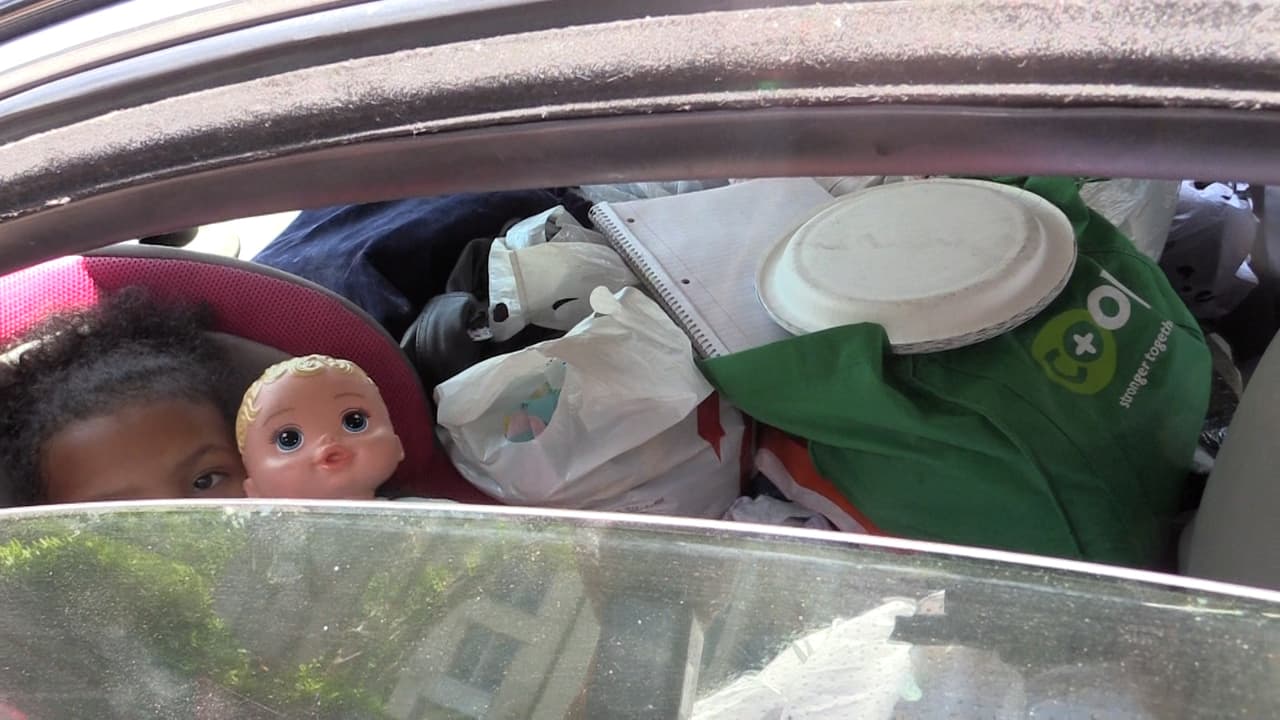 Ella vive en su auto desde el inicio de la pandemia. Aquí tiene bolsas sus con pertenencias, todo lo que tiene cabe aquí en su auto. Entre las bolsas está su hija de cuatro años quien también vive con ella en el auto.