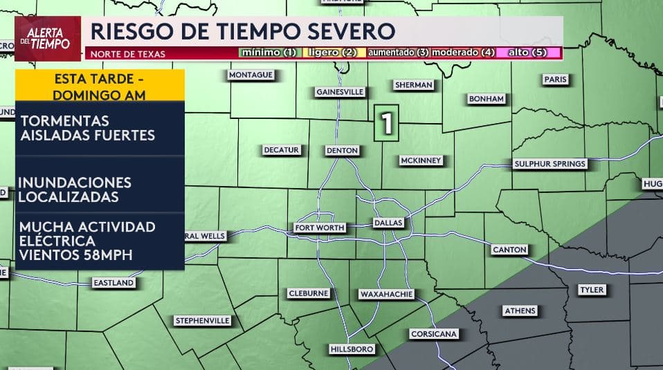 El área de Dallas-Fort Worth se encuentra bajo un riesgo de nivel 1 en la escala del Centro de Predicción de Tormentas (SPC), lo que indica un potencial bajo pero presente de tormentas severas. Los principales riesgos incluyen tormentas aisladas, vientos fuertes e inundaciones.
