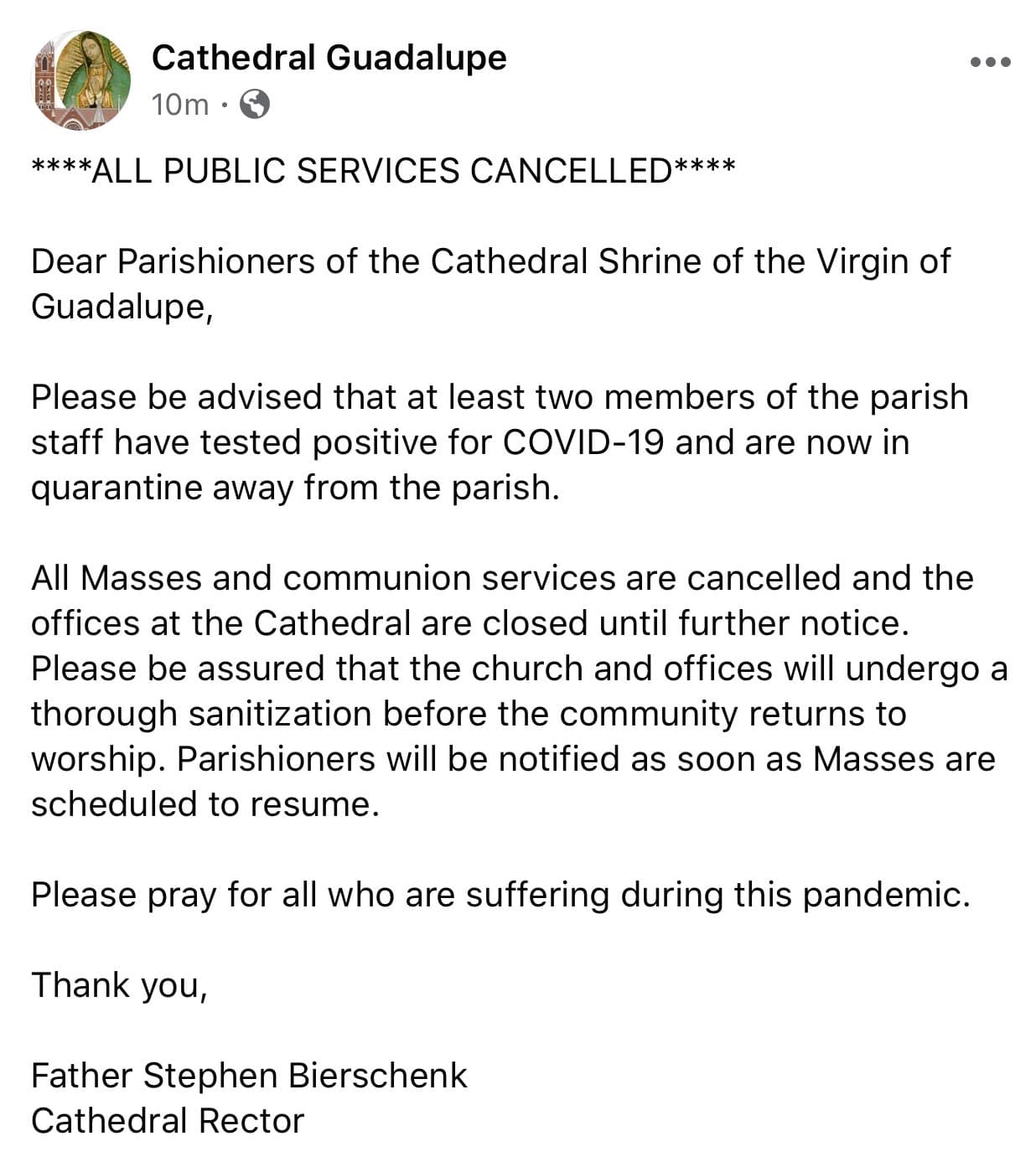 Todas las misas y servicios de comunión fueron cancelados. Las oficinas de la parroquia están cerradas hasta nuevo aviso. Además anunciaron que toda la iglesia y sus oficinas serán desinfectadas antes de que reabran sus puertas a la comunidad.