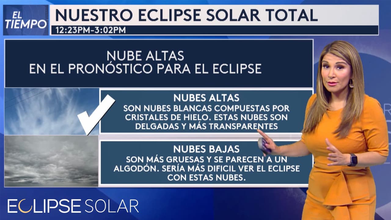 El eclipse total solar es uno de los eventos astronómicos más esperados en el Metroplex de Dallas - Fort Worth y lo que más preocupa es ¿cuál serán las condiciones del tiempo ese día? Tendremos nubes, nos adelanta Nelly Carreño, jefa de meteorología, pero serán nubes altas ¿Sabes cuál es la diferencia? Aquí lo explicamos.