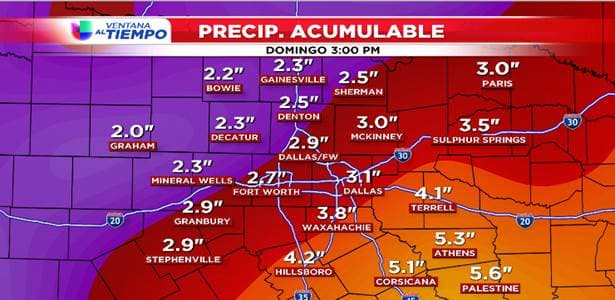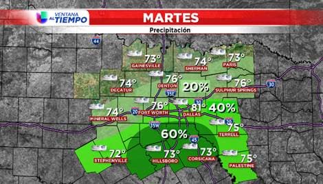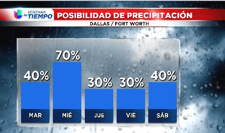 Si la línea de tormentas no cubre todo el norte de Texas o es más débil de lo pensado, podríamos tener otra ronda de tormentas el martes en la tarde. La razón es que simplemente no se robó toda la inestabilidad la primera línea y tendríamos suficiente energía para otra ronda de tormentas. El jueves y viernes bajará la posibilidad a 30%. Esto quiere decir que la mayor parte de ambos días tendremos condiciones secas, pero si veremos algunos aguaceros y tormentas aisladas.