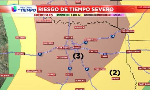 El miércoles en la mañana es cuando aumenta el riesgo de tiempo severo. Tendremos dos oportunidades de fuertes tormentas. La primera será durante la mañana con una línea de tormentas y la segunda posibilidad será en la tarde (esta depende de lo que pase en la mañana). Aquí les tengo más información.