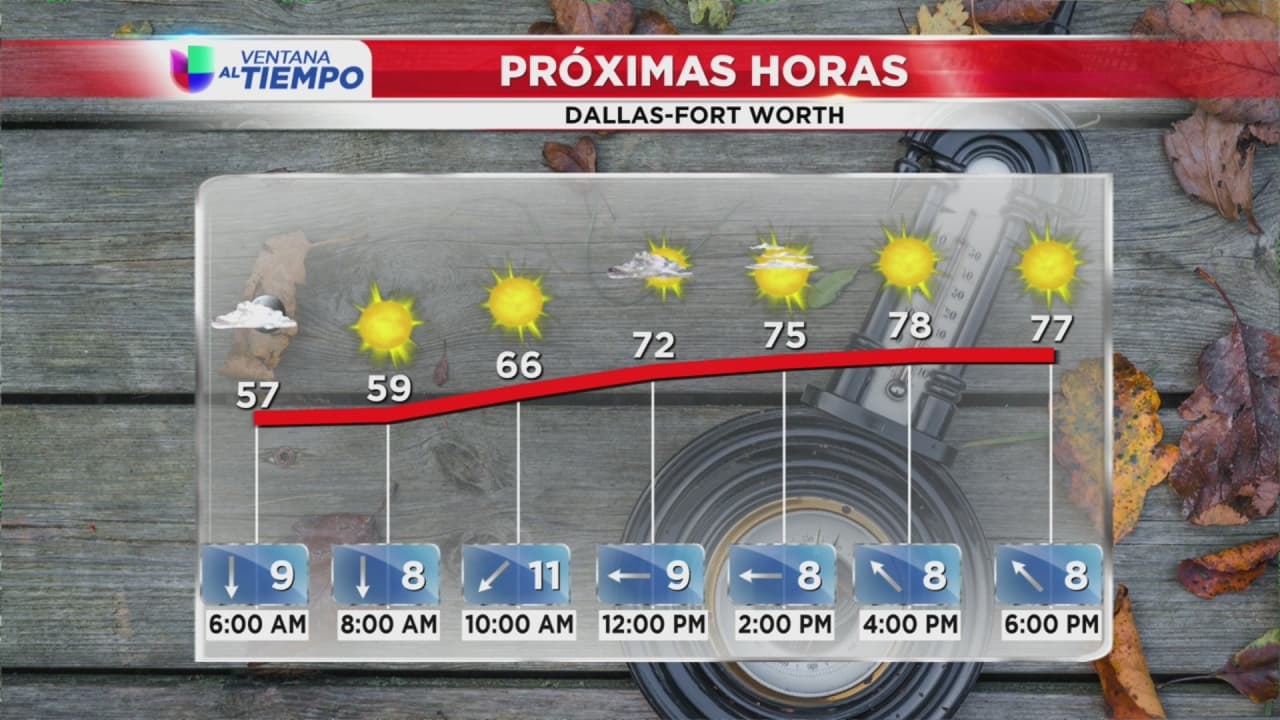Será un día con mucho sol y pocas nubes, ideal para realizar actividades al aire libre. Durante la tarde, las máximas en el Metroplex estarán alcanzando los 70 grados Fahrenheit.