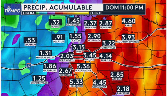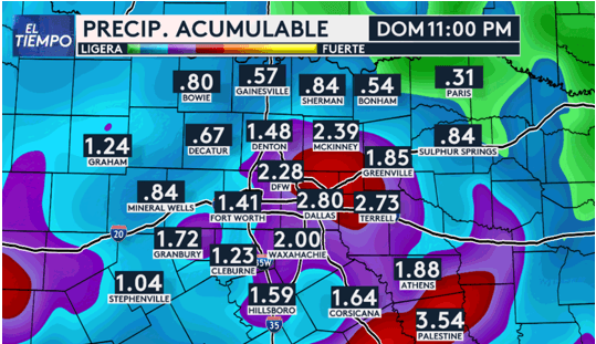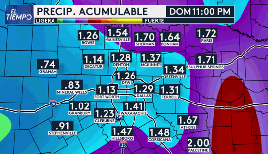 Finalmente, la lluvia se retira en la tarde del domingo. Conjunto de modelos meteorológicos, apuntan que Dallas-Fort Worth podría recibir en las próximas 72 horas, entre 1-3 pulgadas de lluvia.