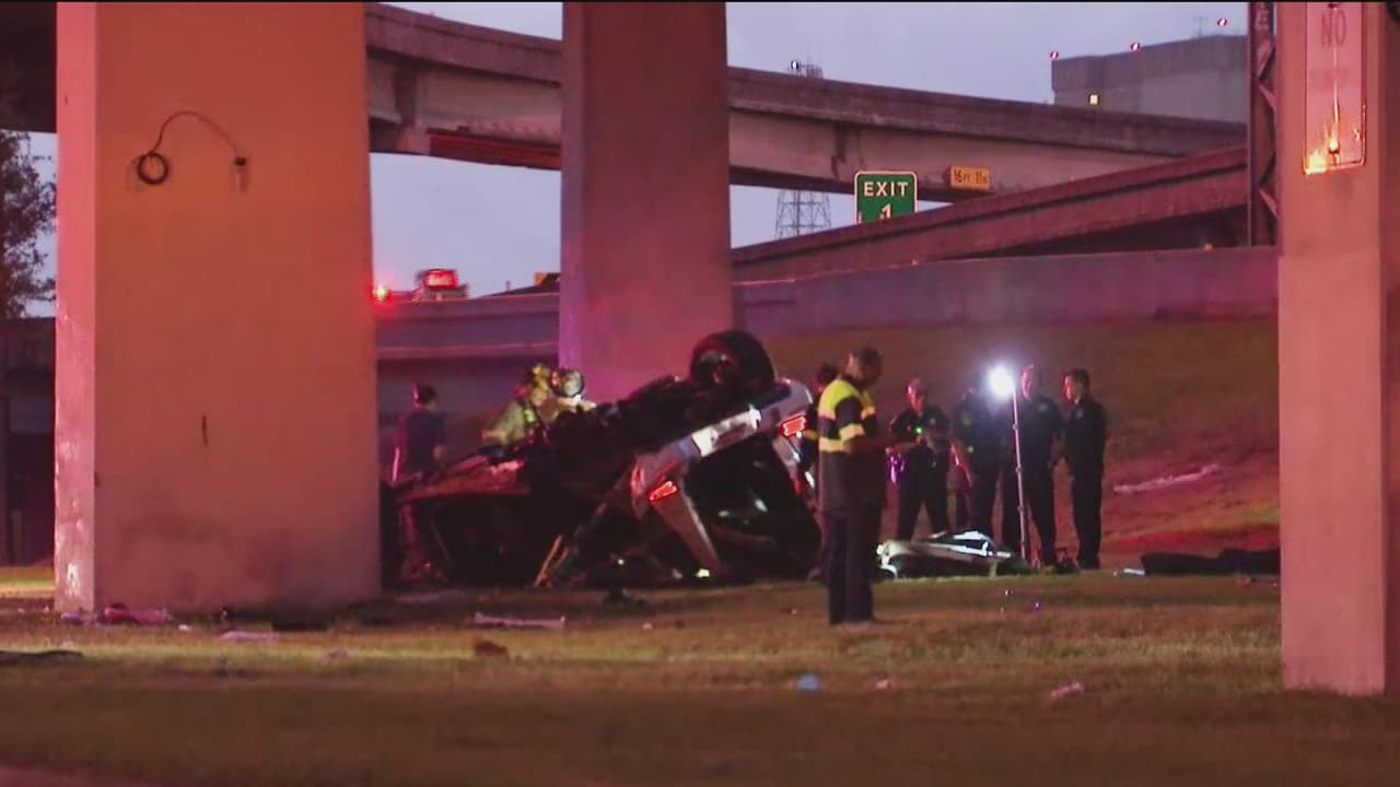 El siniestro ocurrió en la madrugada de este lunes sobre la Woodall Rodgers. De acuerdo con las autoridades, las víctimas se estrellaron con otro vehículo y el auto en el que viajaban perdió el control y terminó impactado contra una de las columnas de concreto de un puente.