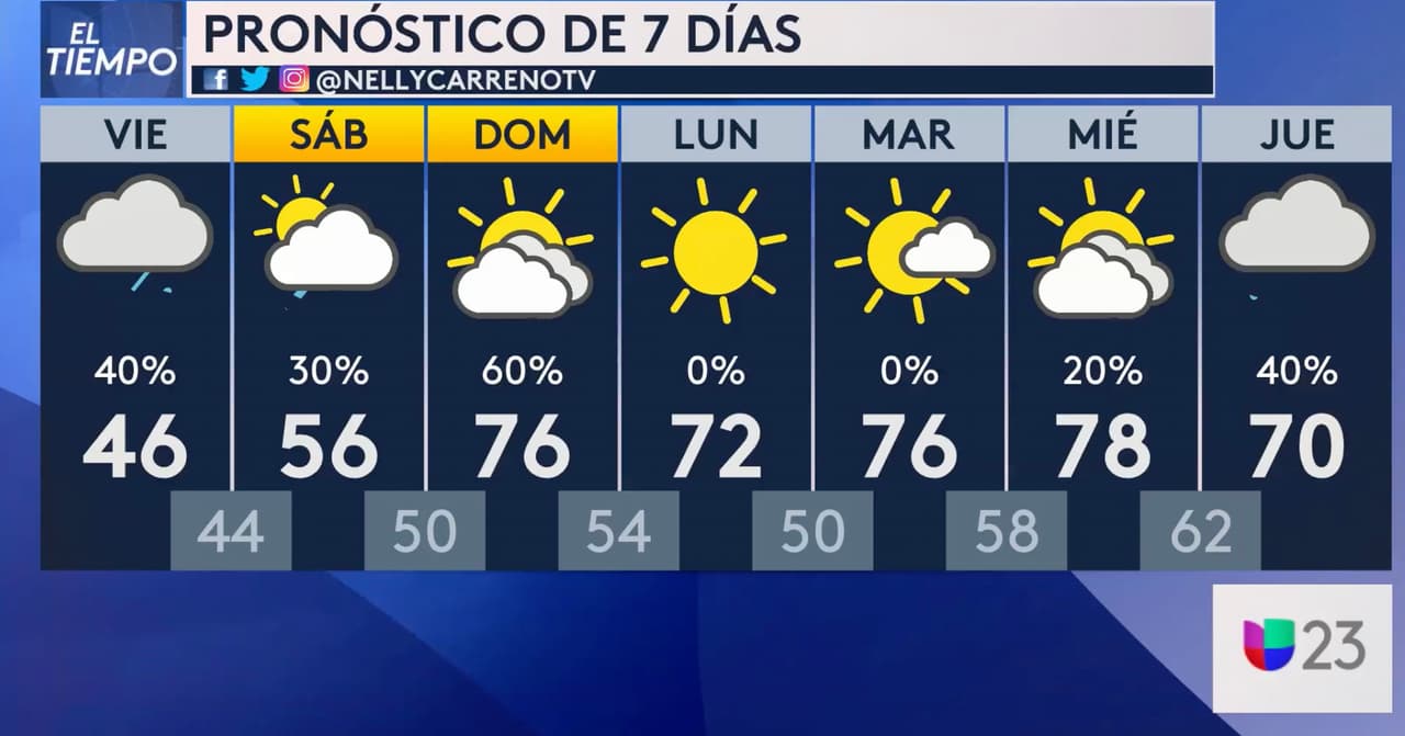 Nuestra meteoróloga Nelly Carreño nos presenta el pronóstico para el final de semana en Dallas – Fort Worth y el norte de Texas. El viernes será el día más frío de la semana, con temperaturas alrededor de los 46 grados, también será un día nublado, al igual que el sábado y el domingo, resalta Nelly. ¿Va a llover? Encuentra aquí la respuesta.