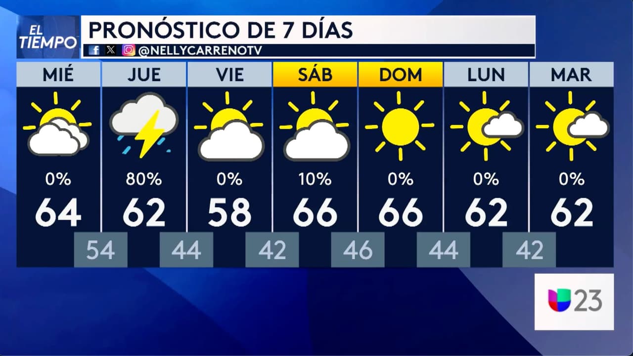 Se acerca un frente frío en el norte de Texas este jueves 30 de noviembre, según nuestra meteoróloga Nelly Carreño. Desde las 6 de la mañana esperamos aguaceros y, después de las 11 a.m., tormentas eléctricas aisladas sin riesgo severo. A las 3 p.m., persistirán algunos aguaceros dispersos. Al final de la tarde, el sistema se desplazará al este sin afectar el juego de los Cowboys de Dallas. Tras el frente frío, la temperatura bajará a unos 50 grados.
