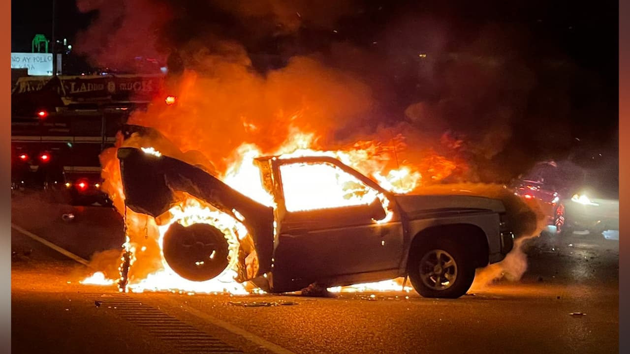 Entonces, entró en la camioneta en llamas y rescató a la mujer. Ella le dijo que tenía dolor, pero que no podía describir fácilmente todas sus heridas. Varias personas que se encontraban cerca ayudaron al oficial a sacarla.