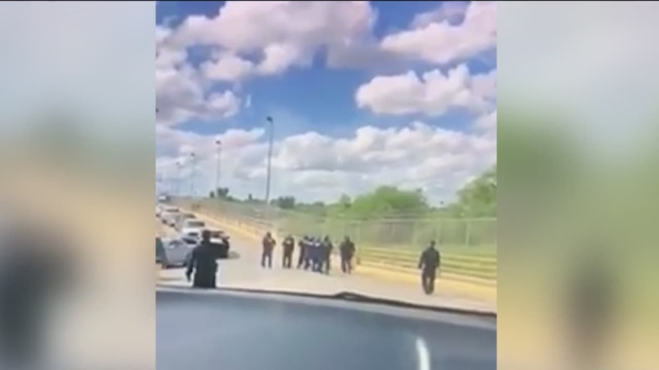 Un peatón que cruzaba el puente internacional en Roma, Texas, grabó a los oficiales presuntamente preparándose para detener la llegada de la multitud que avanza por México desde hace varios días.
