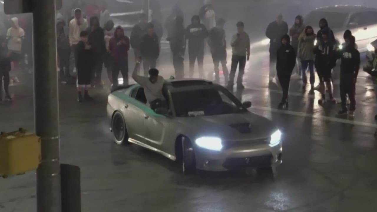 Las cámaras de Noticias Univision 23 captaron el momento en el que decenas de personas se toman una intersección para que varios vehículos puedan hacer arriesgadas maniobras. Cuando los choferes involucrados vieron la presencia de la policía se fueron de inmediato del lugar. Al parecer, uno de los autos se estrelló con una acera.
