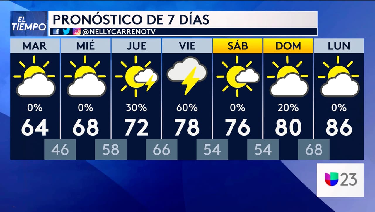 El próximo jueves 30 de marzo, la llegada de un nuevo sistema trae consigo la posibilidad de tiempo severo en Dallas – Fort Worth y el norte de Texas, indica nuestra meteoróloga Nelly Carreño. En las primeras horas del viernes, podrá llegar a Dallas, hasta ahora el riesgo es de 2 en una escala de 5, Nelly resalta que debemos estar atentos a los horarios y cambios. Infórmate y comparte.