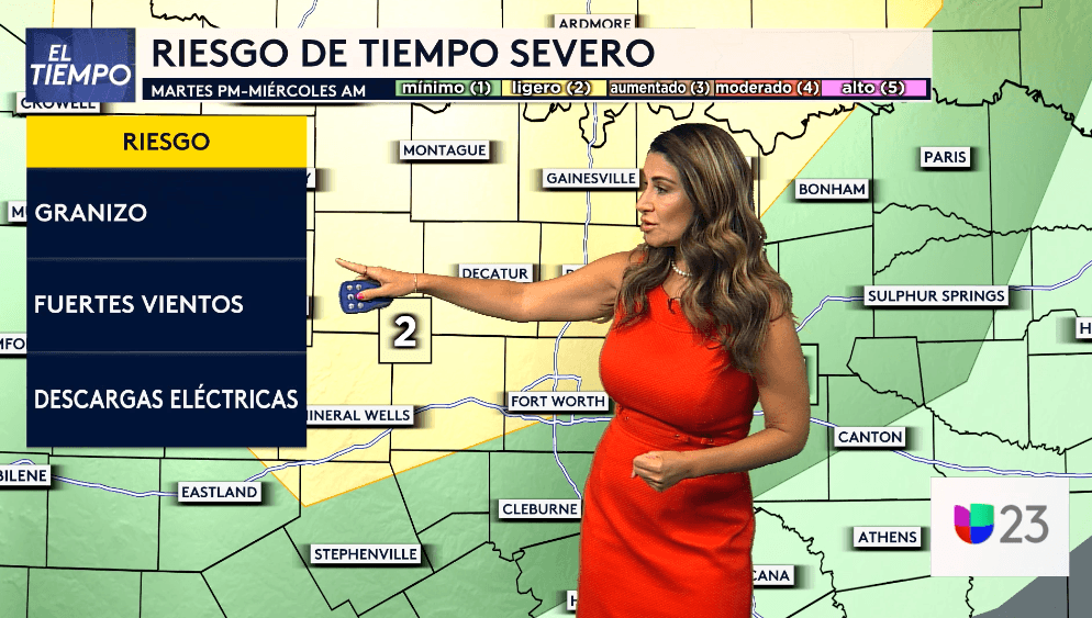 Hay posibilidades de tormentas severas el próximo miércoles 20 de septiembre desde la madrugada, que podrán llegar al Metroplex entre las 4 y 7 de la mañana. Nuestra meteoróloga Nelly Carreño indica que el riesgo, que se mantiene en DOS, dentro de una escala de CINCO, de Fort Worth al norte de la región, y en UNO de Dallas al sur, incluye la posibilidad de granizo, fuertes vientos y descargas eléctricas. Por el momento se descartan tornados.