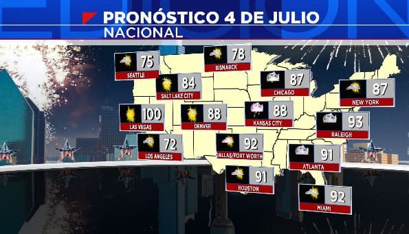 Los estados del este experimentaran aumento de calor y humedad hasta mediado de la próxima semana a medida que un anticiclón se posiciona al este de la nación. Temperatura máxima variara desde los 70s a 90s. Especial atención al estado de Nevada, temperaturas estarán reportándose de tres dígitos. El calentamiento diurno dará como resultado posibilidades diarias de aguaceros y tormentas desde la región suroeste hasta el Medio Atlántico este 4 de Julio.
