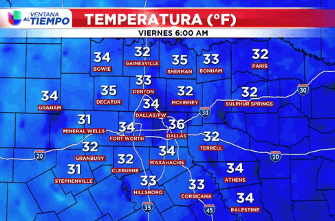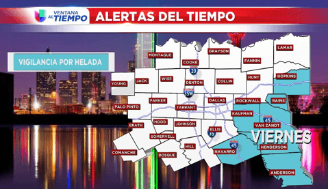 Una vigilancia por helada para la noche de jueves-mañana de viernes se extiende a la mayoría de los condados del norte de Texas menos Navarro, Henderson, Van Zandt, Kaufman y Rains, debido a que las temperaturas estarán entre 28º-32º.