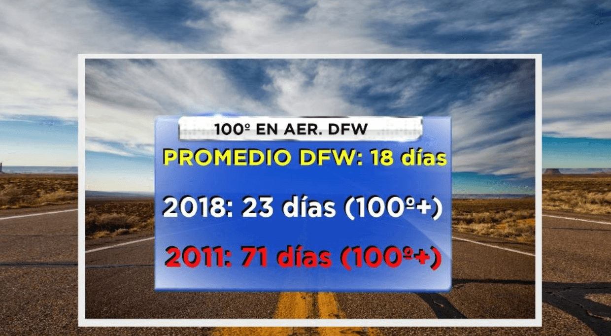 Lo que va de año el aeropuerto DFW no ha registrado temperaturas de 3 dígitos. Climatológicamente el 1ro de julio está marcado como el primer día que se registra los 100 grados en DFW, mientras que el último día es 26 de agosto.