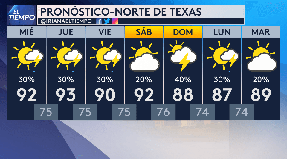 El área de Dallas-Fort Worth registrará temperaturas que se ubicarán en los 90 grados Fahrenheit. Algunas tormentas podrían llegar acompañadas de numerosas descargas eléctricas y aguaceros torrenciales.