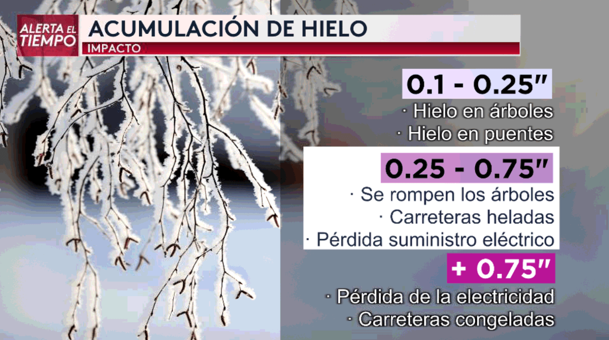 Las temperaturas se mantendrían por debajo del punto de congelación, y se esperan impactos entre miércoles en la noche hasta el viernes en la mañana. Si se acumula mucho hielo, las condiciones peligrosas pudieran extenderse hasta el sábado.