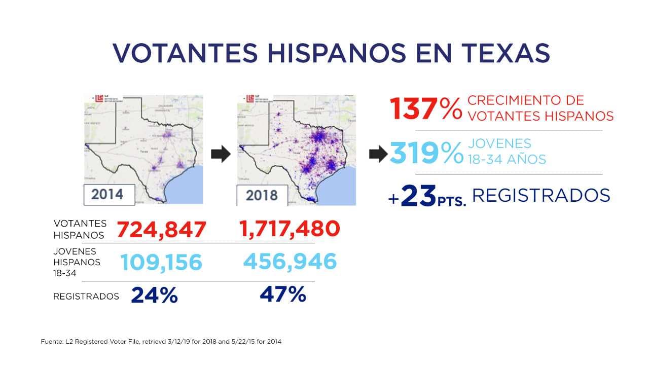 Durante las elecciones de medio término en el 2018 se registró un 137% de crecimiento de votantes hispanos. Hubo un crecimiento de 319% en jóvenes de 18-34 años y un aumento de 23% registrados.