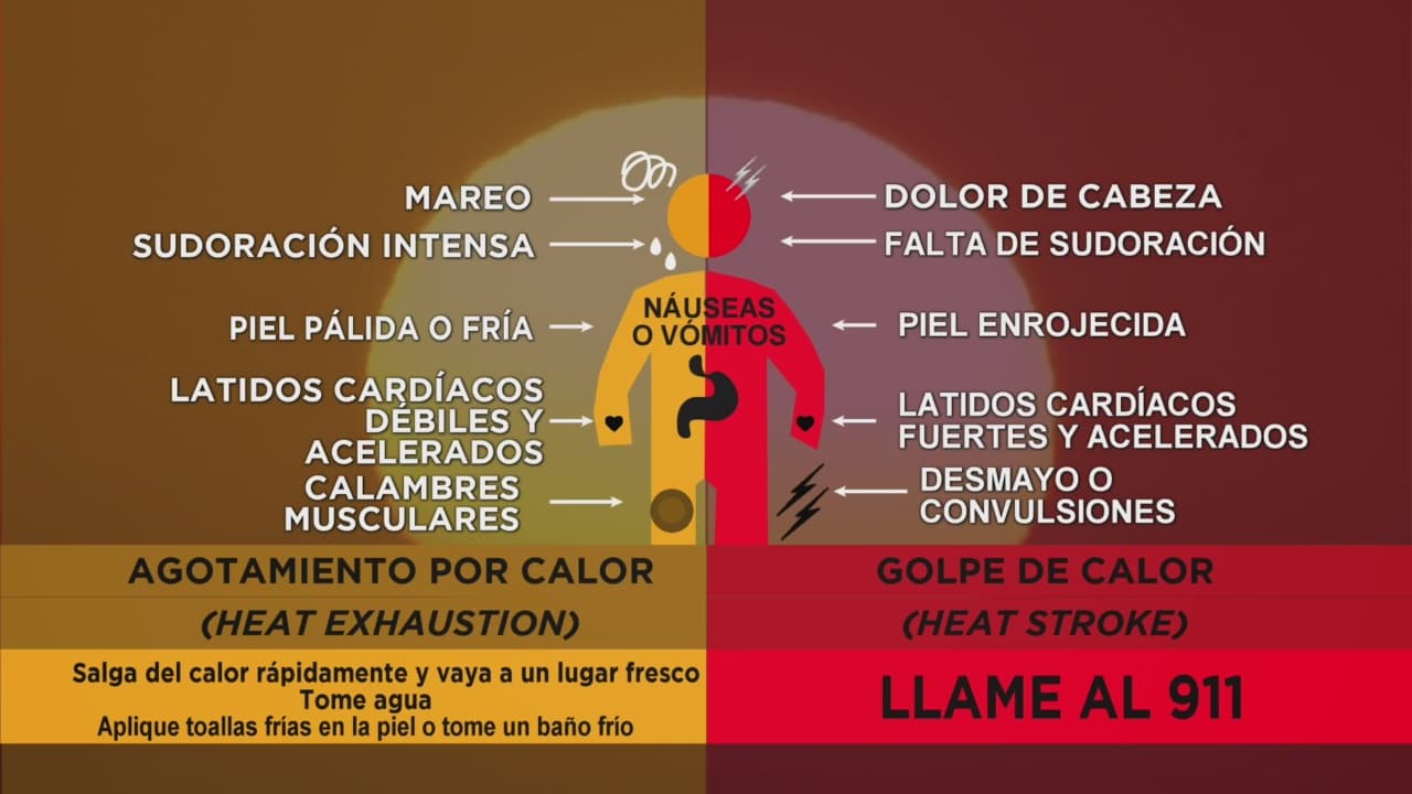 Este trastorno ocasionado por las altas temperaturas puede provocar dolor de cabeza, falta de sudoración, piel enrojecida, latidos cardíacos fuertes y acelerados, desmayos o convulsiones. Las autoridades recomiendan llamar al 911 en caso de presentar estas señales y aprender a diferenciarlo con un agotamiento por calor.