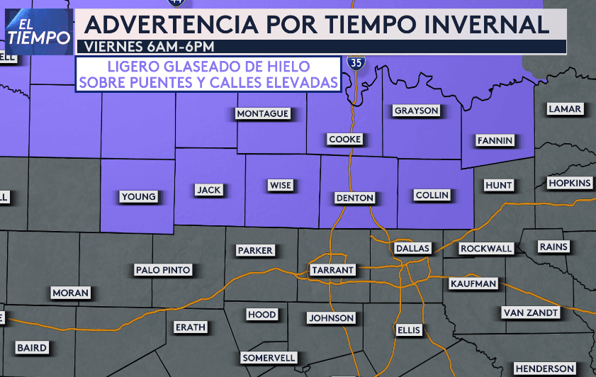 La Advertencia por Tiempo Invernal incluye los condados Denton y Collin para el viernes de 6am a 6pm. Ligero glaseado de hielo será posible sobre puentes y carreteras elevadas en estos condados. Además, se esperan acumulados de nieve o aguanieve entre 1/10"-1/2".
