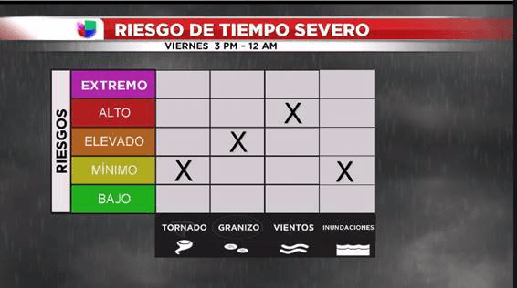 Los riesgos principales son fuertes vientos 60 mph+, granizo grande de hasta 2” de diámetro y tornados.
