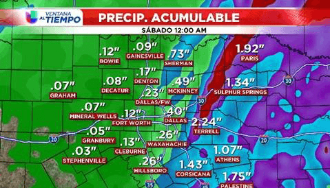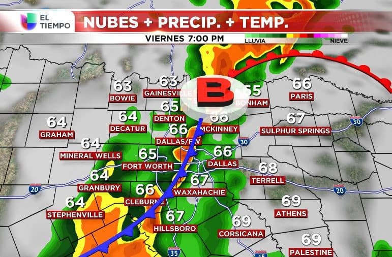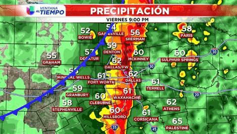 El viernes en la mañana tendremos aguaceros dispersos. Alrededor de las3 pm se formarán tormentas eléctricas en una línea adyacente al frente frio y se moverá del oeste hacia el este sobre el Metroplex.