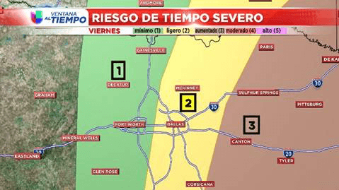 Aunque todos tenemos que estar pendientes, la zona con más inestabilidad será hacia el este de Dallas. Esta área incluye las ciudades de Greenville, Emory, Canton, Mineola y Sulphur Springs.