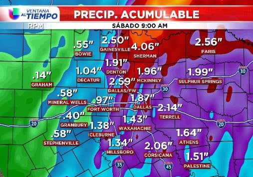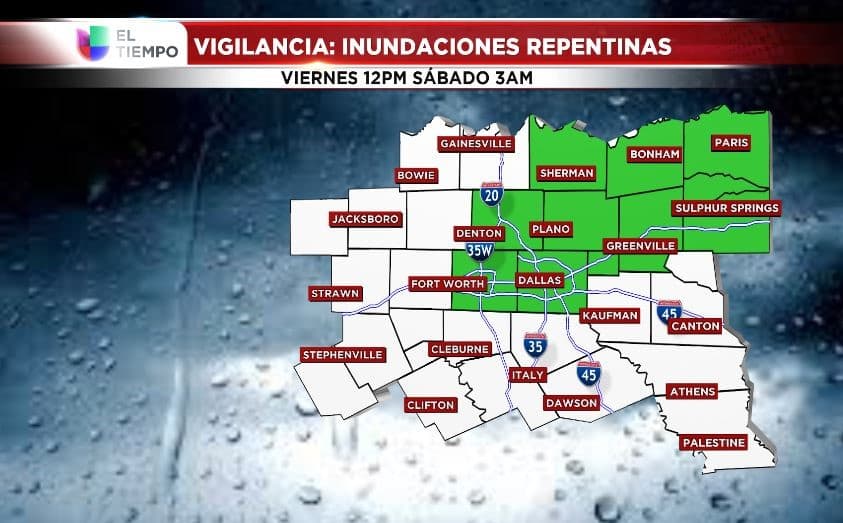 Además se ha emitido Vigilancia por inundaciones repentinas para los condados Tarrant, Dallas, Collin, Denton, Rockwall, Hunt, Grayson y Fannin.