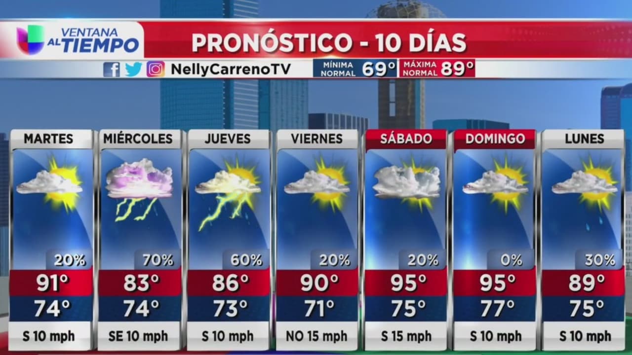 Según el pronóstico, hay un 20% de probabilidades de tormentas que caerán en la zona de Grapevine y Fort Worth. Las temperaturas máximas serán de 91 grados Fahrenheit, mientras que las mínimas estarán en los 74 grados.