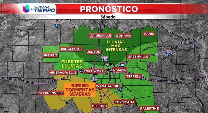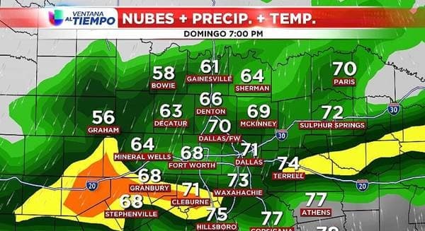 Existe una pequeña ventana de tiempo en la que se podría registrar un tiempo severo al sur de la I-20 (al sur y el este de Dallas) antes del frente frío del domingo al atardecer. Esto incluirá lugares como Canton y Waxahachie. Se espera que rondas de fuertes lluvias se formen detrás del frente frío del lunes y el martes, lo que podría traer más amenazas de inundaciones repentinas y desbordamiento de ríos.