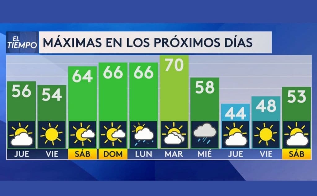 Se espera frío con máximas de entre los 56 y 54 grados para este jueves y viernes, mientras que el fin de semana será un día agradable con mucho sol y vientos tranquilos. Recuerda descargar nuestra aplicación de Noticias 23 para recibir las alertas del tiempo.