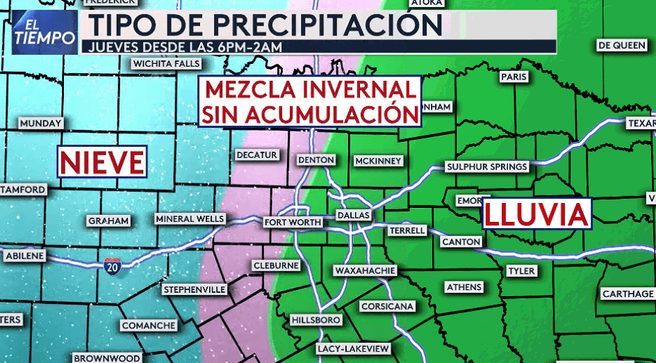 Residentes al oeste de los condados Tarrant y Denton podrían ver ligera mezcla invernal con lluvia entre las 6pm y 2am. Pero no se espera acumulación ni impactos en las vías. Esto debido a que las temperaturas a nivel del suelo estarán lo suficientemente cálidas para derretir cualquier mezcla invernal.