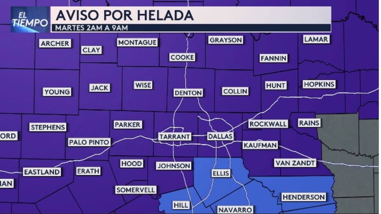 Se podrán ver incluso algunas capas de hielo la mañana de este martes, así que se pide que conduzcas con precaución si vas a tu trabajo o escuela. El Aviso por Helada es para los condados de Dallas, Denton, Tarrant, Decatur, Sherman, Bowie y Terrell hasta el martes a las 9:00 AM.