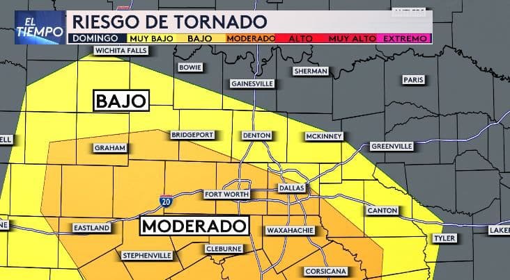En el Metroplex, también el mayor riesgo podría ser de fuertes vientos, aunque no se descarta la posibilidad de granizo y tornados.
