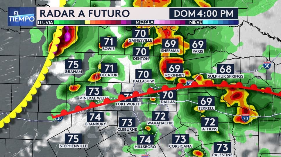 Para Dallas - Fort Worth esperamos varias tormentas entre las 3:00 p.m. y 5:00 p.m. Como puedes ver en la siguiente gráfica, las lluvias y aguaceros cubrirán gran parte del Metroplex a las 4:00 pm y las temperaturas estarán entre los 68 y los 75 grados.